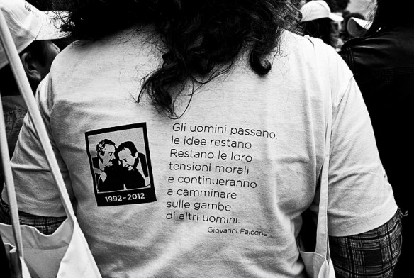 Ayer Palermo conmemoró el vigésimo aniversario de la muerte de Falcone con una gran manifestación que llegó hasta el antiguo domicilio de Falcone, donde un enorme árbol recoge mensajes, regalos y flores. Se conoce como «el árbol de Falcone». El lema en la camiseta de la joven dice: «Los hombres pasan, las ideas permanecen. Permanecen sus tensiones morales, y seguirán caminando a pies de otros hombres. Giovanni Falcone»