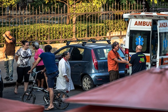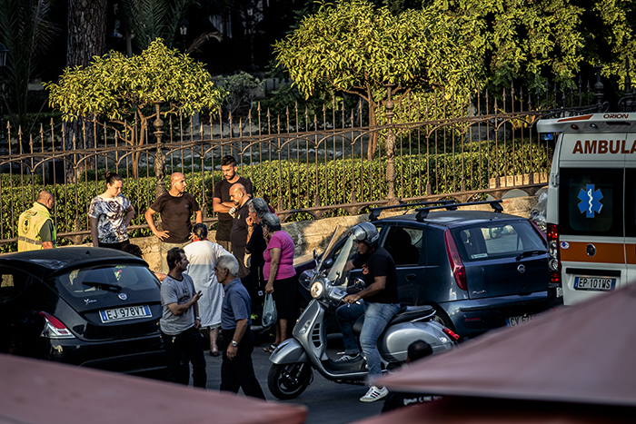 It’s the sundown and a noisy siren is heard, I run to the window and see an ambulance in the square, the usual small bunch of people around someone lying on the ground. Out of habit I grab the camera, put the tele and begin to shoot.