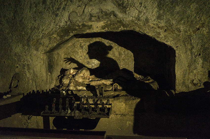 We are in the cemetery of Le Fontanelle, one of this weird things you find only in a town like Naples. In a huge cave through past centuries they left thousands of anonymous bodies as a result of several plagues and famines. Now people use the bones as ex-votos. Don’t worry for the shadow on the wall, it’s my daughter Claudia, she is a fan of Tim Burton.